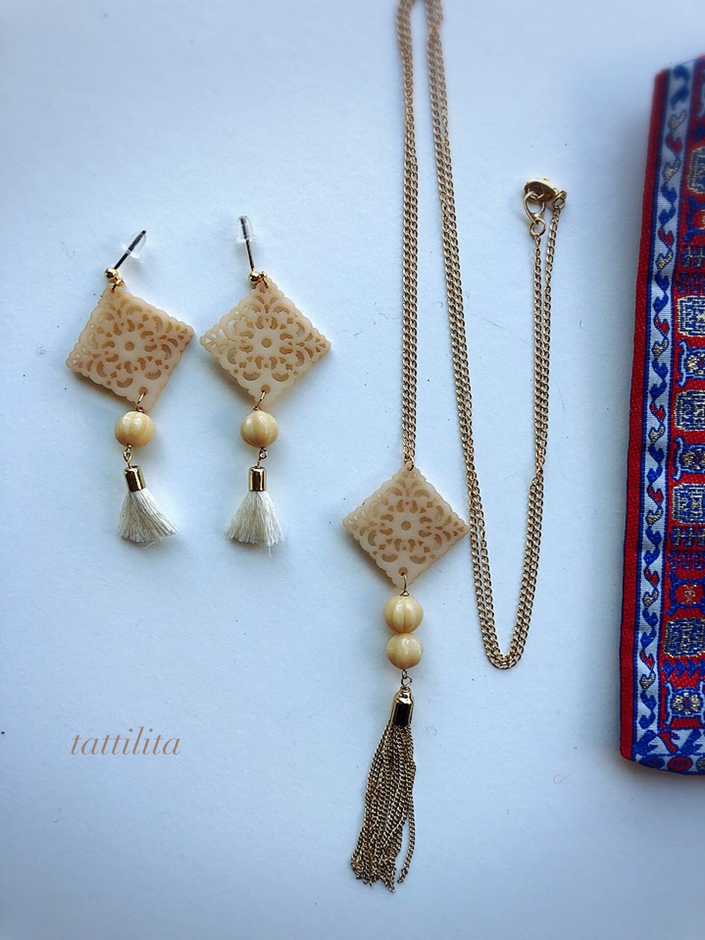 #透かし模様#クリーミー#とろみ色#ベージュ#タッセル#ピアス#ネックレス#セット販売が#お得!