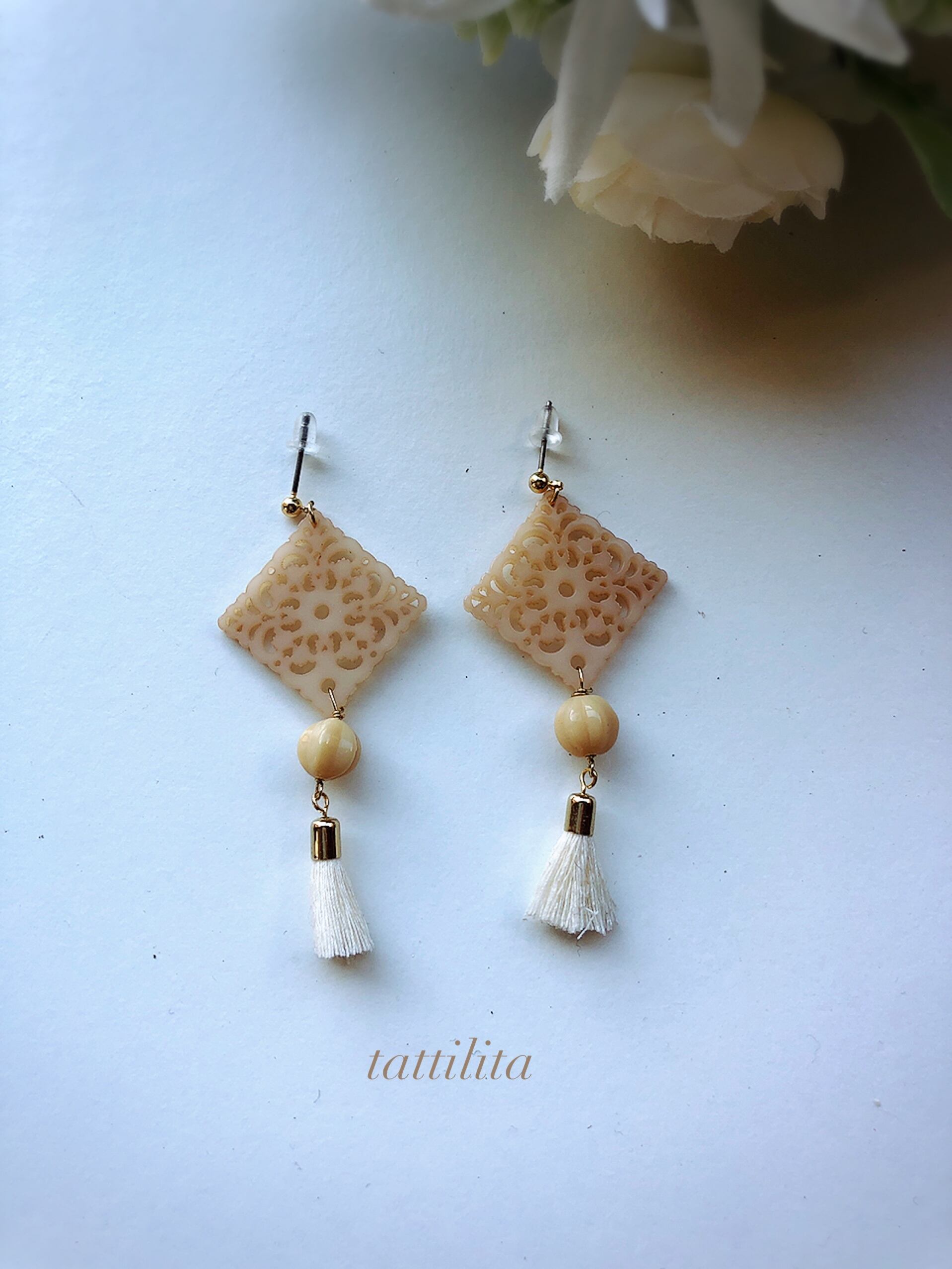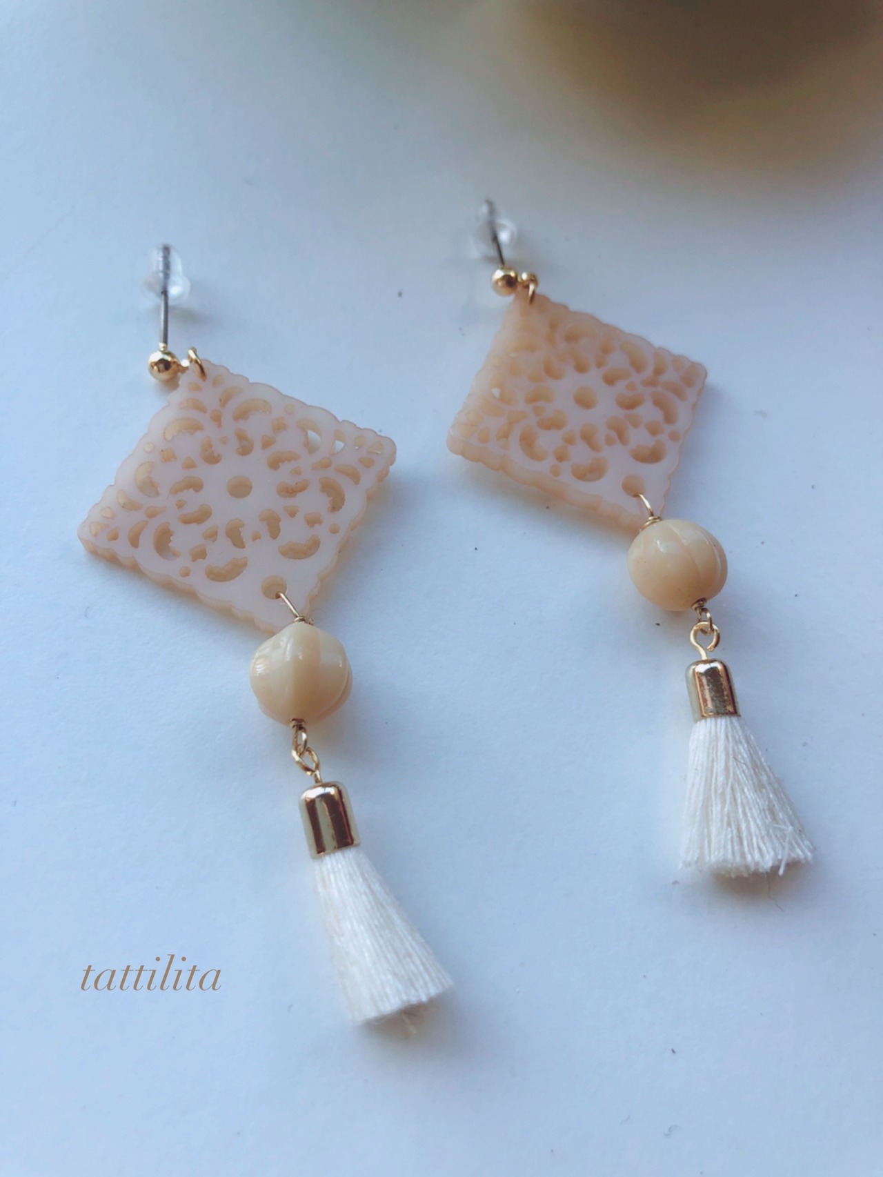 #透かし模様#クリーミー#とろみ色#ベージュ#タッセル#ピアス#ネックレス#セット販売が#お得!